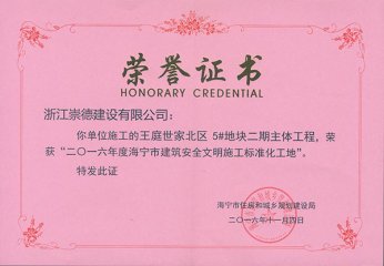王庭世家2016年度標(biāo)準(zhǔn)化工地榮譽證書