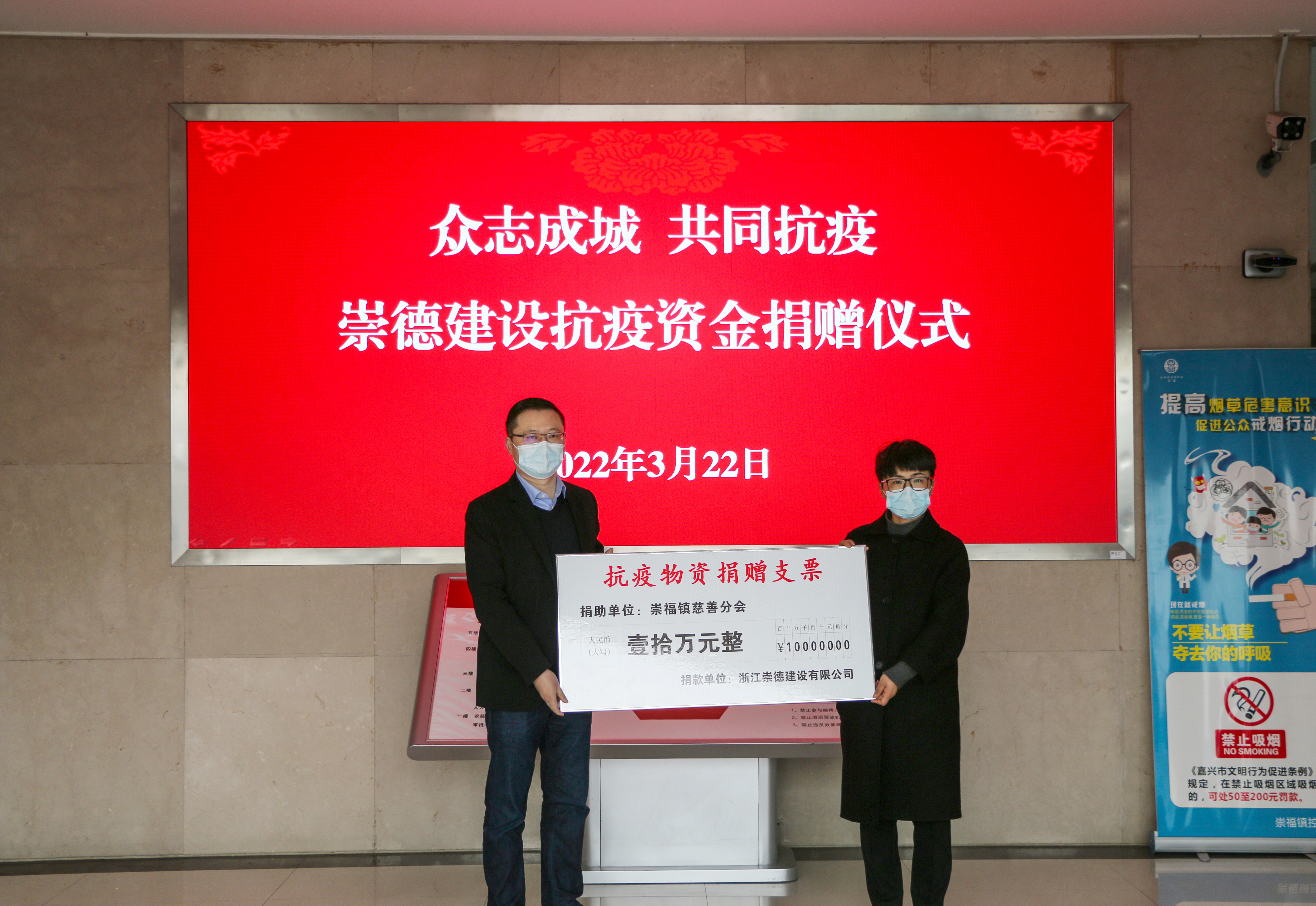 共戰(zhàn)疫情,有你有我。2022年3月22日,浙江崇德建設(shè)有限公司抗疫資金捐贈(zèng)儀式在崇福鎮(zhèn)鎮(zhèn)政府大廳內(nèi)舉行。桐鄉(xiāng)市慈善總會(huì)會(huì)長(zhǎng)沈濟(jì)賢、崇福鎮(zhèn)黨委副書(shū)記沈亞平、浙江崇德建設(shè)有限公司董事長(zhǎng)郁振華等出席。